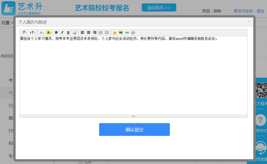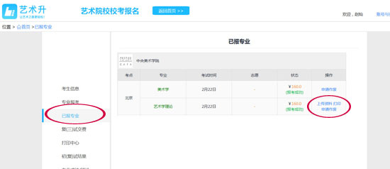 2.填写完成后点击确认提交。提交后可以修改,也可以打印。打印和修改方式如下,登录艺术升网站(手机APP不能操作)后,在首页选择“艺术院校校考报名”后,选择左侧“已报专业”,在“操作”中,“上传资料”可以添加和修改,“打印”按钮即打印“综合信息测评表”。