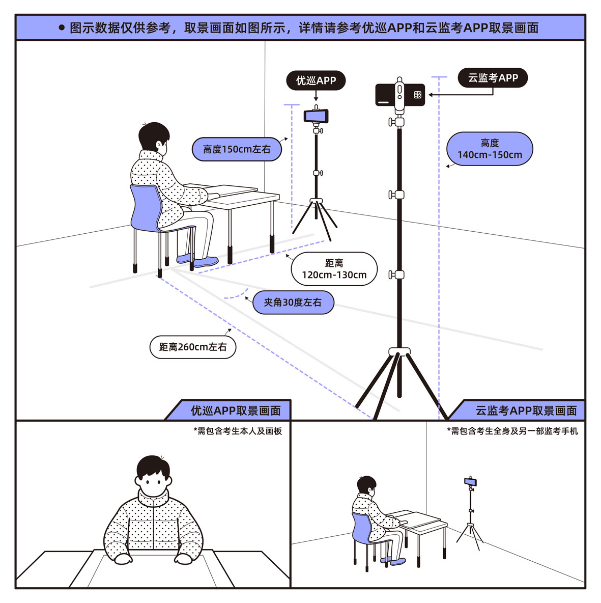 1.考生须提前布置考试环境,参加在线测试或模拟考试,调试好相关设备,按要求布置好两部手机的拍摄距离和角度。