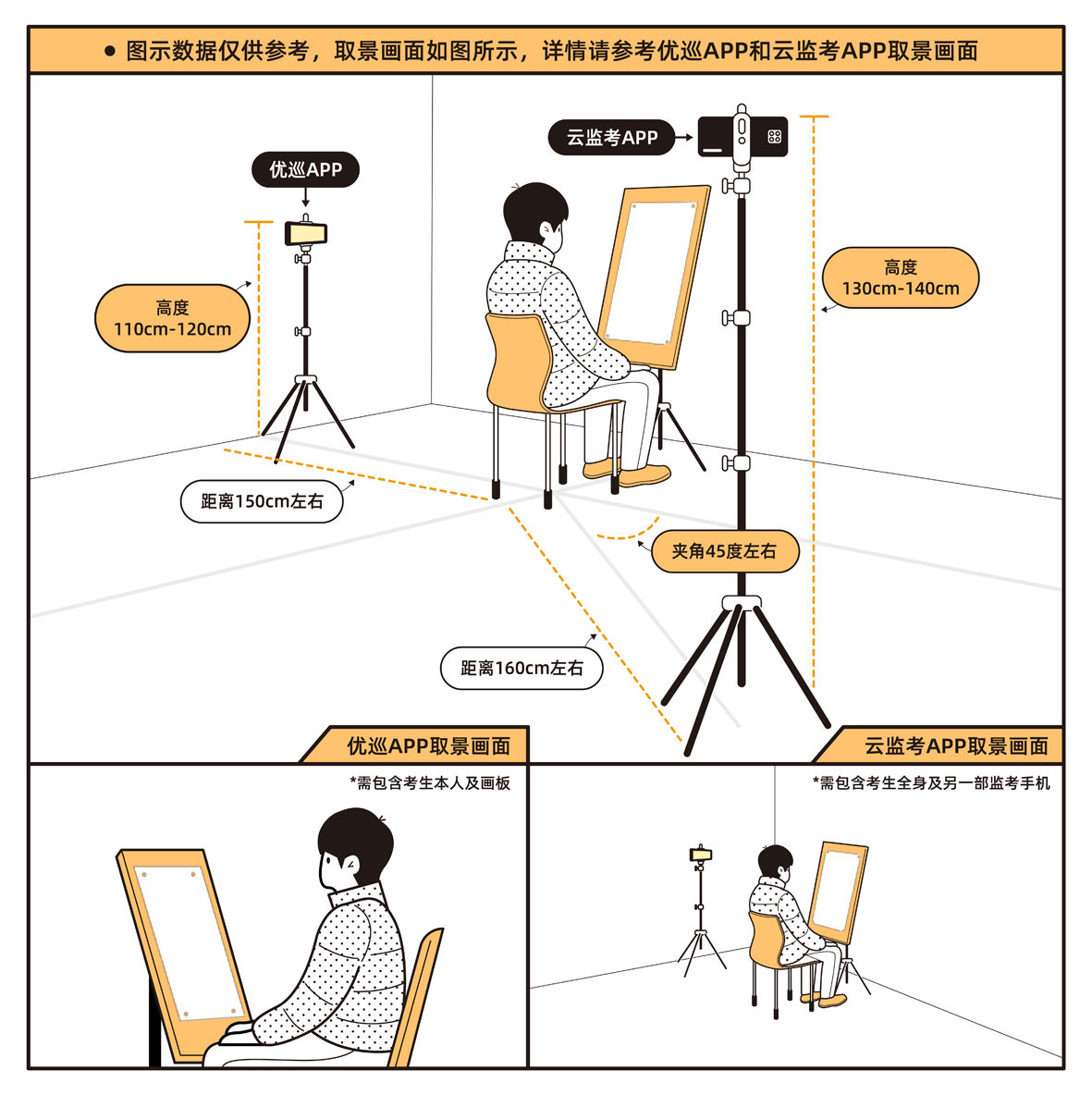 考生须按图示位置摆放画板画架或桌椅,调试拍摄距离和光源,保证录制画面清晰。