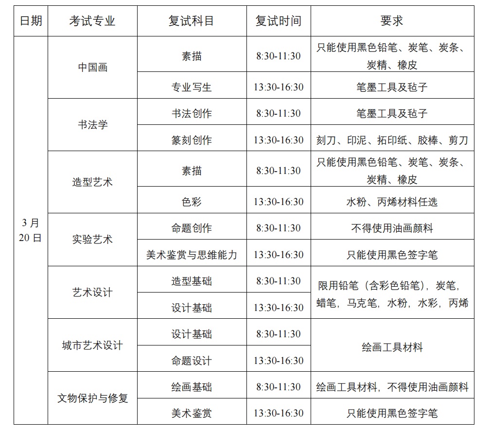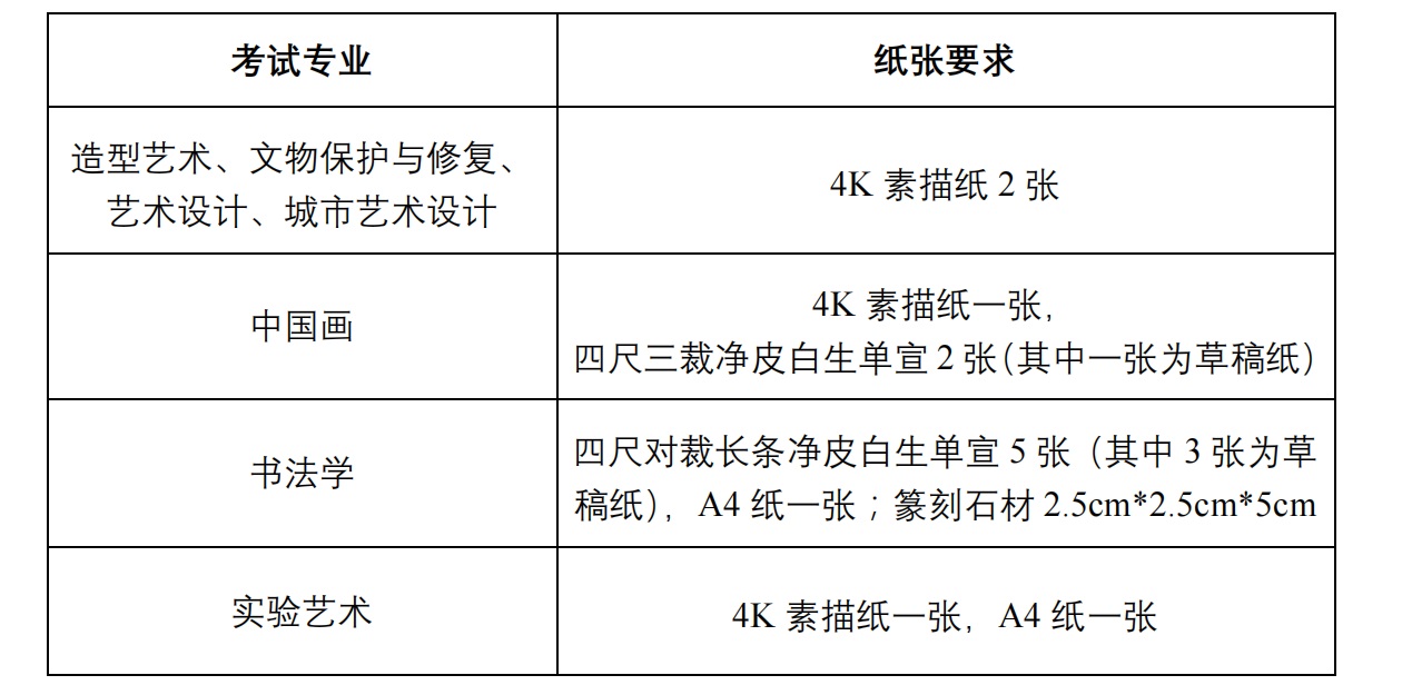 8.目前因疫情封控无法收寄考试用纸区域的复试考生需于3月16日前在“央美招生”微信公众号后台报备信息,信息格式如下:姓名,身份证号,目前所处具体地址,封控起始时间,同时需自行准备考试用纸和包装,解除封控后考生需第一时间将考试用纸寄回学校。
