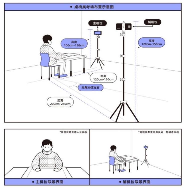 考生须面向墙壁按下图所示布置考场,调试拍摄距离和光源,保证两部手机的录制画面清晰,录制界面与图示取景界面一致。考场区域须干净整洁,不得有规定外的其他物品,不得设置监考盲区,否则按违规处理。