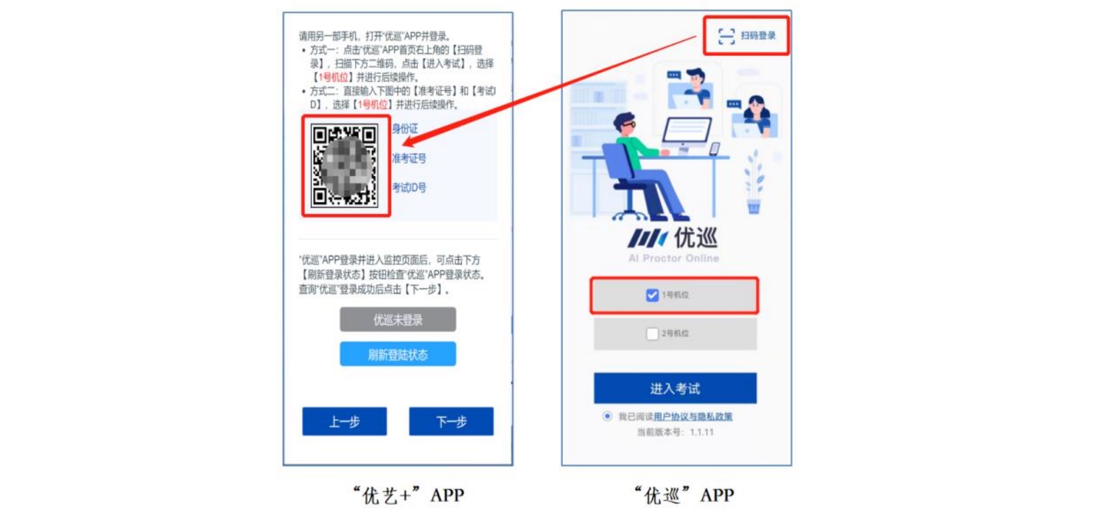 3.登录“优巡”APP :“优艺+”APP界面显示供“优巡”APP登录的考试ID、准考证号/身份证号和二维码信息。考生打开另一部手机的“优巡”APP,点击界面右上角的扫码登录,或直接输入准考证号/身份证号和考试ID登录“优巡”。选择1号机位进入考试准备,完成声音测试和人脸识别后按提示进入监控界面。