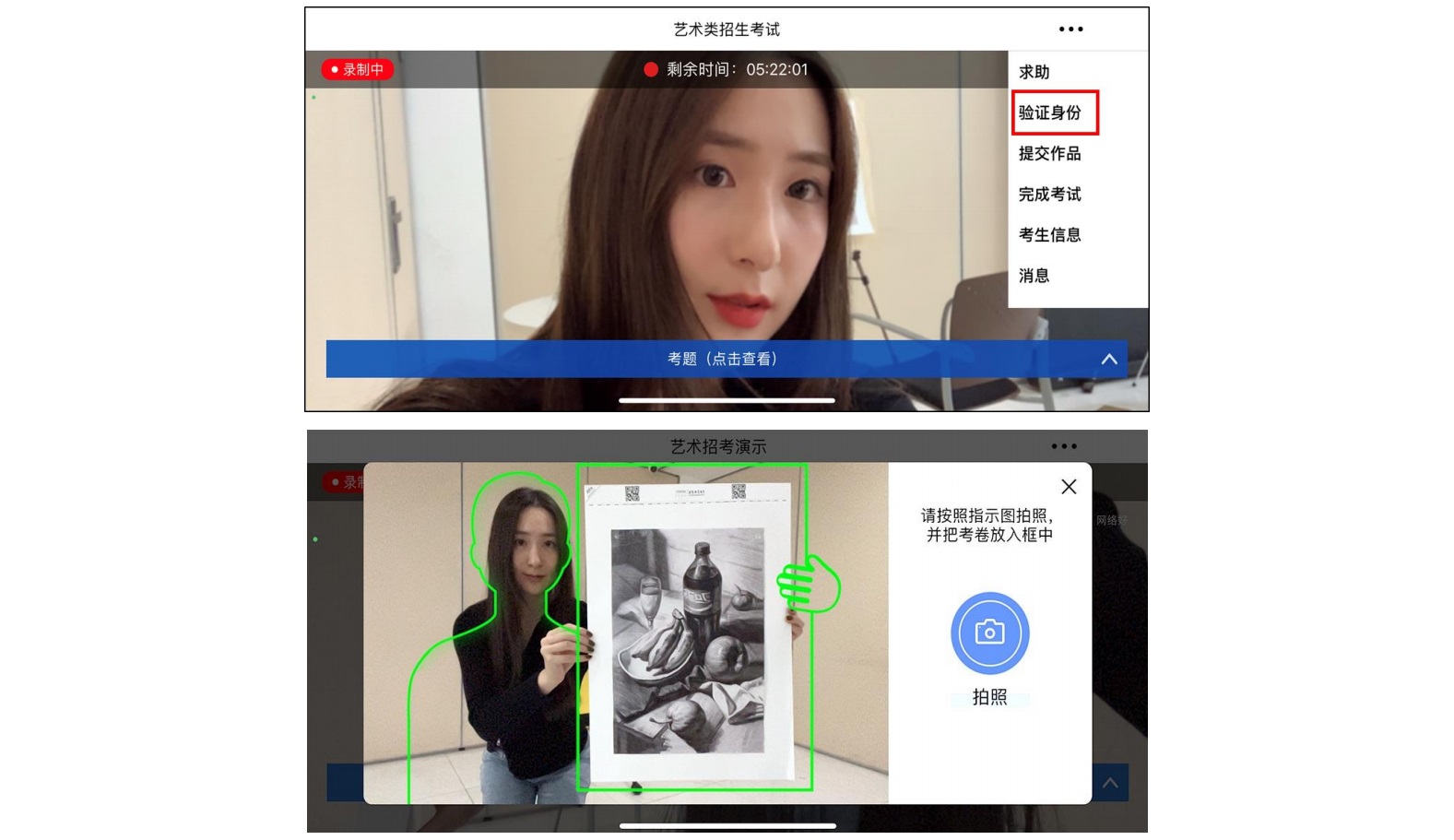 考生按照指引在“优巡”APP前点击界面右上角“…”中的“验证身份”按钮,按照界面提示点击“拍照”按钮,倒计时5秒自动拍摄,完成身份验证,未通过者可多次核验。