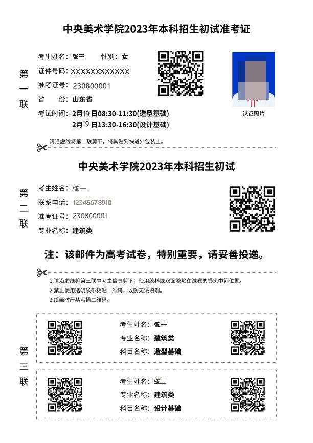 2.书法学、建筑学专业准考证第三联印有2条考生信息二维码,其他专业印有1条考生信息二维码,准考证样图如下:
