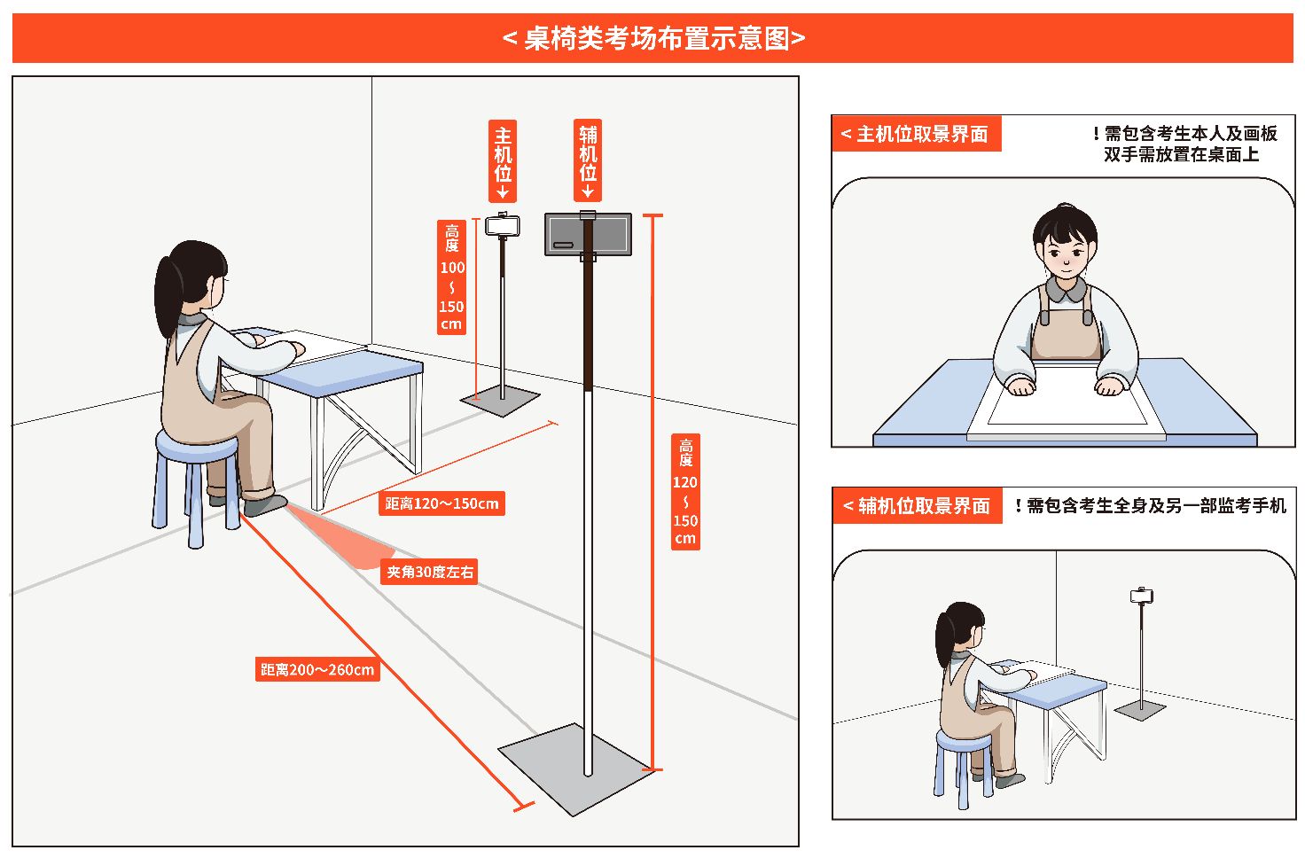 考生须面向墙壁放置画板、画架或桌椅,墙壁不得带有转角,不得故意设置监考盲区。考生须按下列图示要求布置考场,提前调试拍摄距离和光源,确保2部手机的录制画面清晰,录制界面与图示取景界面一致。