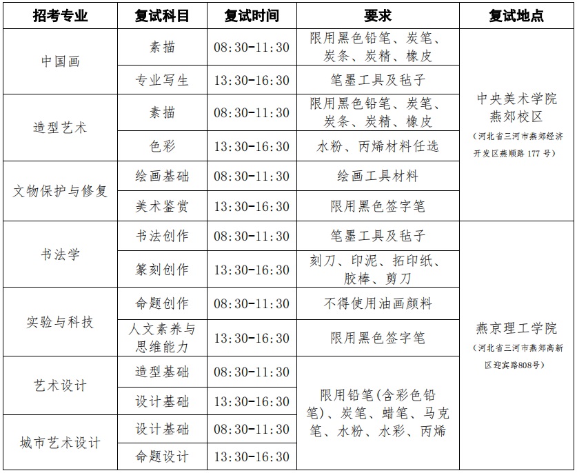 1.考生需自备绘画材料、画板、画架、笔墨毛毡等考试用具参加复试。考试用纸和篆刻石材由学校提供。
