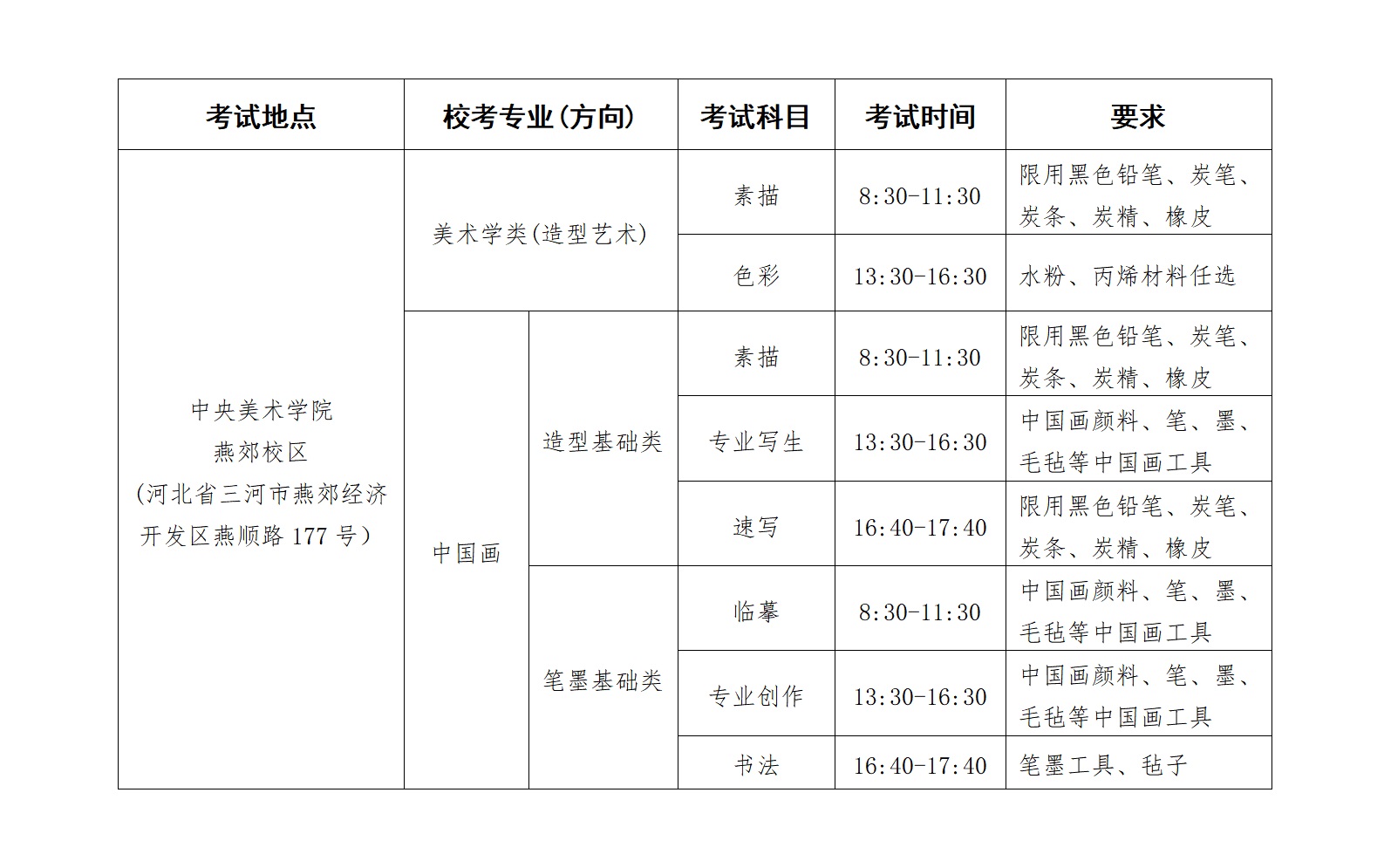 (一)考生自备画板、画架(应具调节功能)、绘画材料、笔、墨、毛毡、黑色签字笔等考试用具,考试用纸和篆刻石材由学校统一提供。