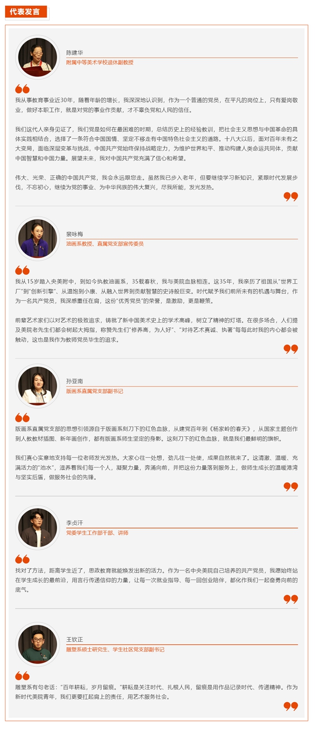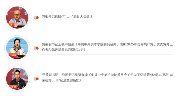会议强调,面对新时代、新使命,各级党组织要切实发挥战斗堡垒作用,持续推进党建与业务工作深度融合,将政治优势转化为艺术教育创新发展的澎湃动能。全体党员要秉承“爱国为民 崇德尚艺”的优良传统,深入学习贯彻习近平新时代中国特色社会主义思想,特别要聚焦学习党的创新理论,自觉将其融入艺术创作、教学实践和管理服务之中,为早日建成具有鲜明中国特色的世界一流美术学院而努力奋斗。