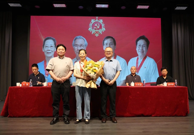党委书记徐扬、院长林茂为“光荣在党50年”老党员代表陈建华颁发纪念章